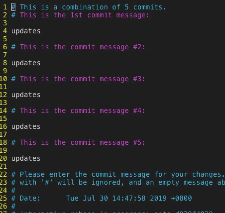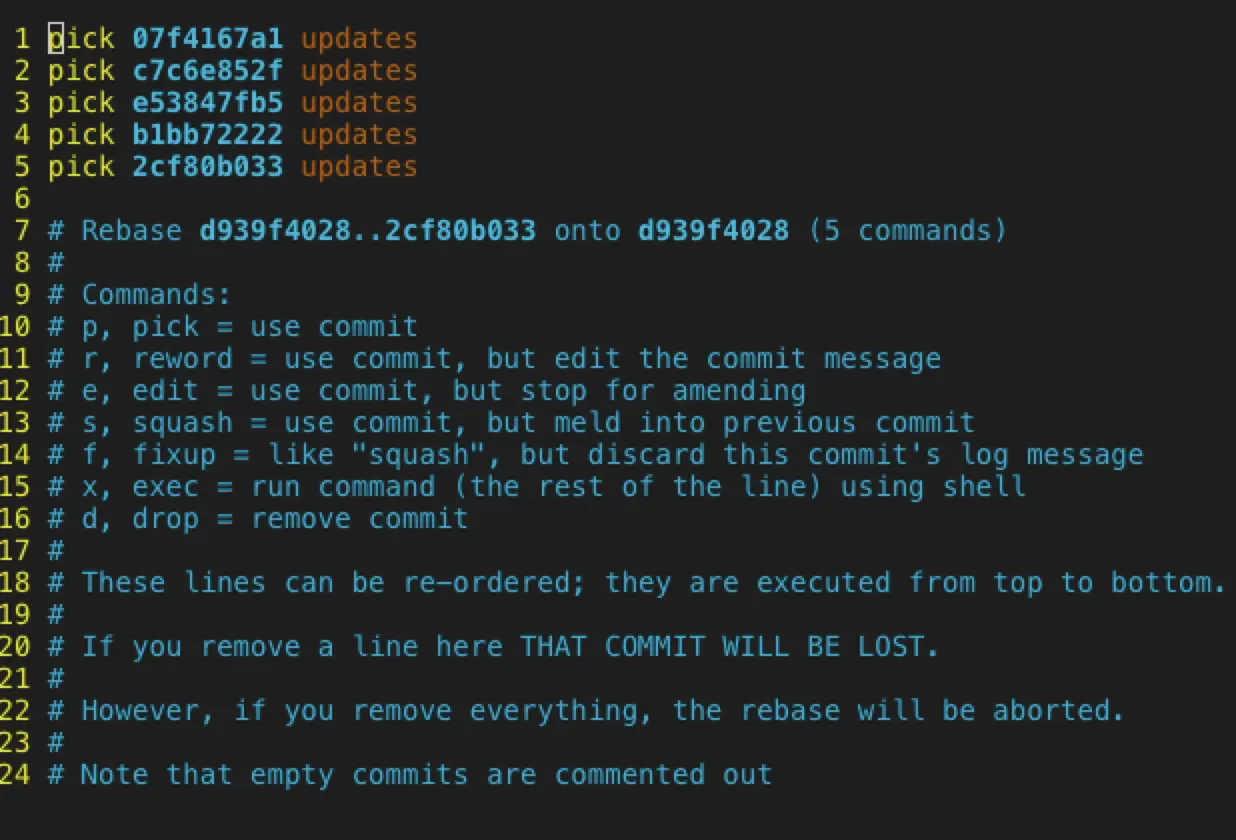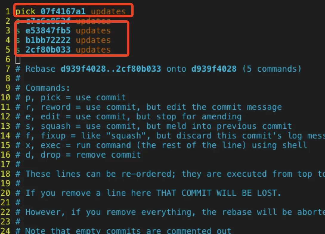 git rebase -i HEAD~X x 代表从当前的提交记录往回回溯的提交记录的个数,执行这个操作之后我们就可以看到一个这样的交互界面:
