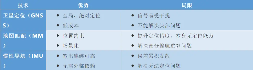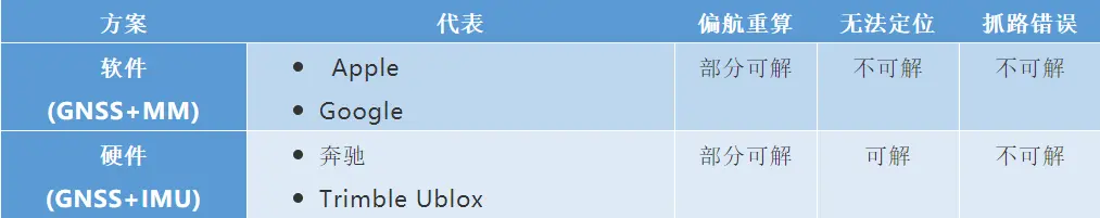 车机融合定位项目解决的是道路级的定位问题,受限于硬件性能,目前市场上通用的技术方案有两种,如下表1所示: