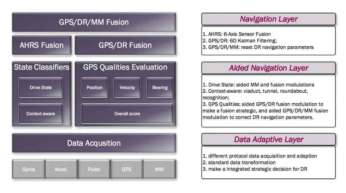 表1表明,目前市面上存在的通用方案并不能完全解决偏航重算、无法定位和抓路错误这三个问题,尤其是抓路错误。为此,在技术层面上,我们将两套通用方案进行融合,提出了一套软+硬(GNSS+MM+DR)方案;在算法层面上,依靠高德的数据优势,以数据融合模块为核心,一方面提高定位结果可靠性,弥补硬件性能上的不足,另一方面对抓路错误问题进行专门的算法设计。