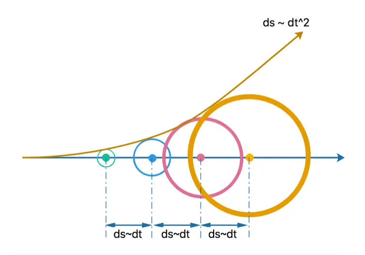 无GPS信号环境时,定位只能依靠DR算法。DR算法精度主要取决于IMU(陀螺仪和加速度计)和测速仪的误差,陀螺仪误差将引起位置误差随时间的二次方增长,测速仪误差将引起位置误差随时间线性增长,如图5所示: