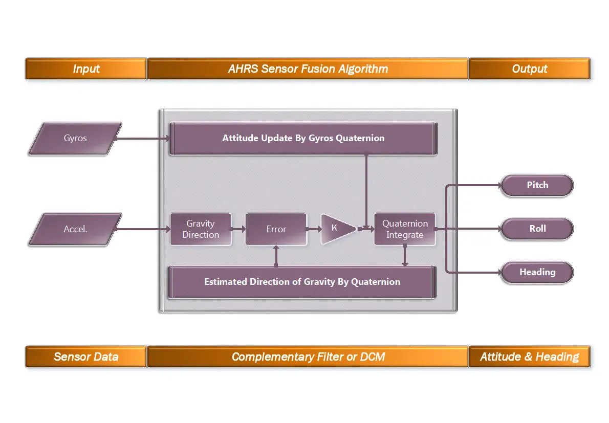 姿态编排使用的是AHRS(Attitude andheading reference system )融合算法,处理后输出车机姿态信息。姿态编排流程如图6所示: