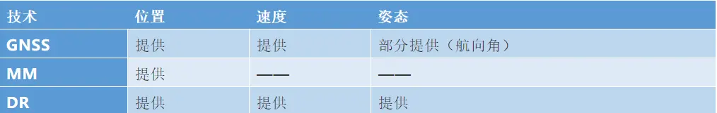 车机融合定位项目使用了GNSS、MM和DR三项技术,每项技术能够提供全部或部分车机导航信息,如表3所示。以位置信息为例,GNSS、MM和DR都输出车机位置,但由于不同技术手段有各自的误差源,致使不同技术的定位结果并不相同。