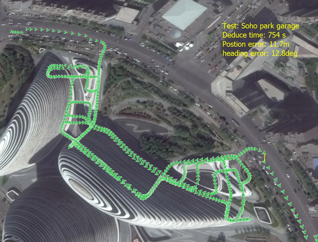 为验证有无陀螺仪动态零偏估计对DR方向和位置解算精度的影响,本项目采集了望京soho停车场的数据,经解算,效果如下。测试表明,经动态零偏补偿后,DR精度明显提高: