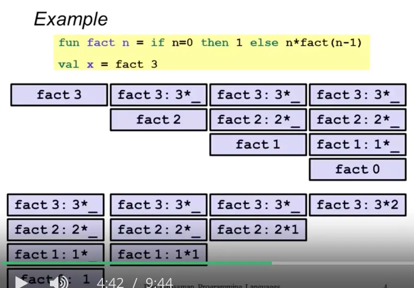 if e1 then e2 else e3如果这个if表达式整体在尾位置,那么e2,e3是在尾位置let b1 … bn in e end如果这个let表达式整体在尾位置,那么e是在尾位置。- 函数调用时的参数不在尾位置。因为我们任然需要去evaluate参数表达式,以及调用函数体。