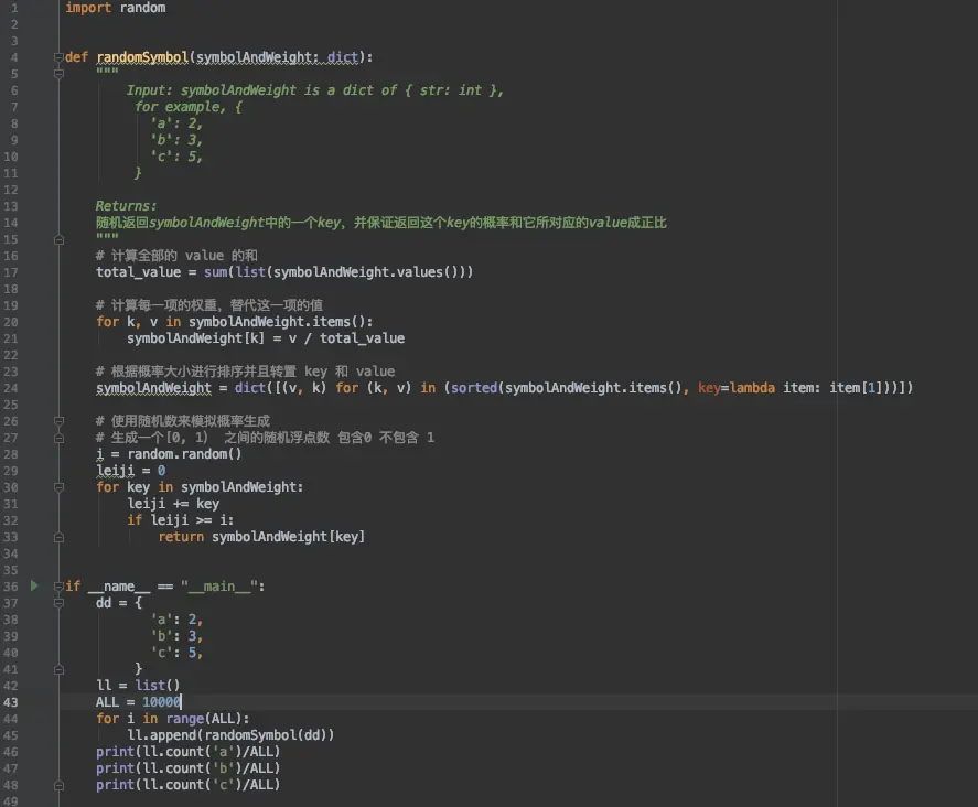 题目: 随机返回字典中的一个key,并保证返回这个key的概率和它所对应的value成正比。 假设 key 为 str 类型,value 为 int 或者 float 类型。 例如: