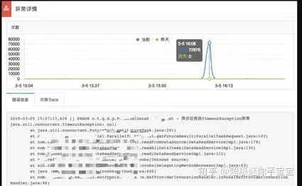 点击异常,直接跳转到异常诊断界面,发现异常在同一时刻突增,并且把异常栈和上下文给打印出来了。