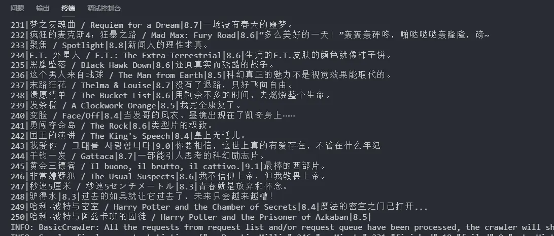 到这里,就已经实现了一个简易的爬虫,但是还没有实现我们的需求(爬取完整的top250)。我们需要动态的去添加url,才能爬取到完整的250部电影。