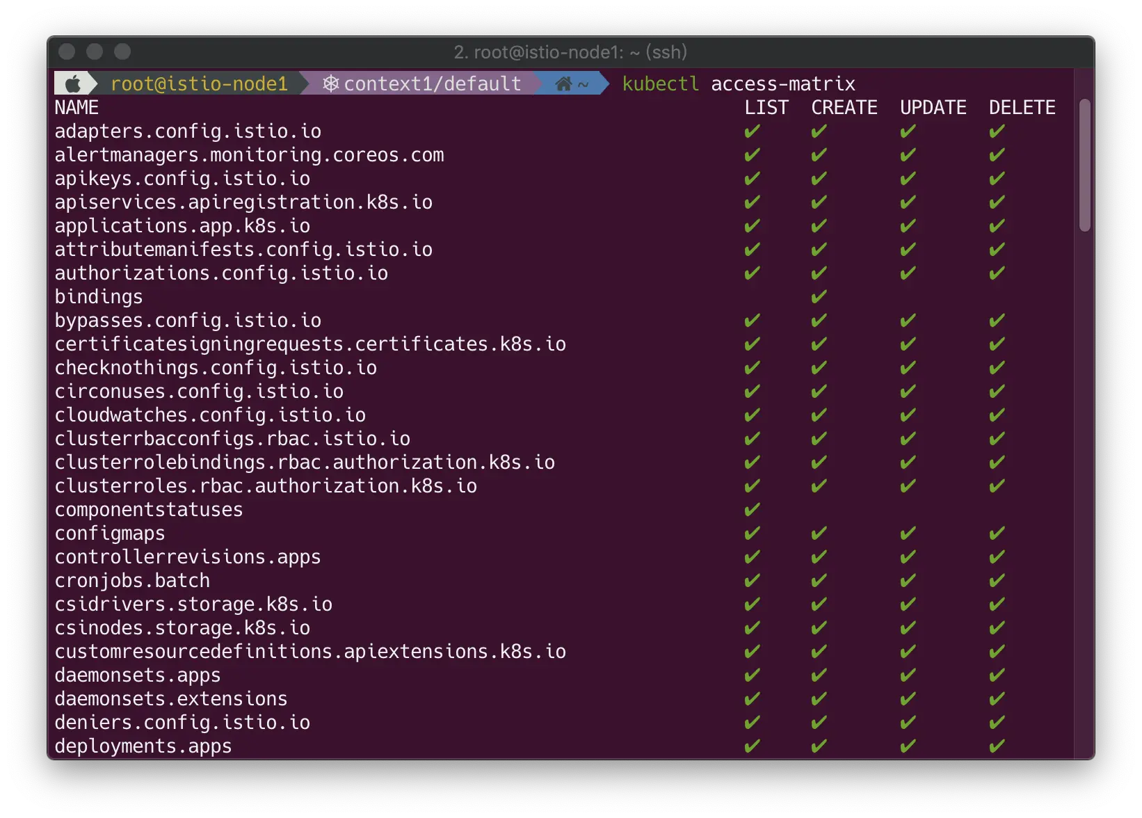 使用方法也很简单,如果想查看当前用户对所有资源的访问权限,可使用如下命令:
