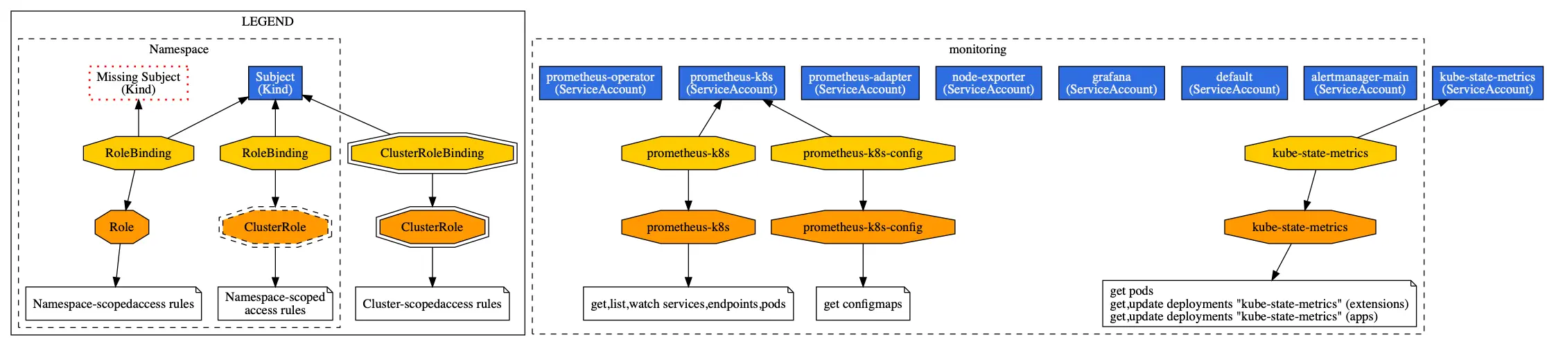 rbac-view 也可以用来可视化账户与权限之间的关系,但与 rback 不同,它是一个 web 应用,安装方法参考官方文档。