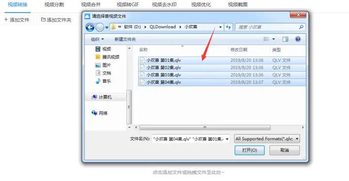 1、首先打开视频转换器,把腾讯视频下载好的qlv格式添加到软件中。添加的方式有很多,可以点击添加文件或添加文件夹按钮添加视频文件或文件夹,也可以用拖拽的方式直接把视频添加到软件中。
