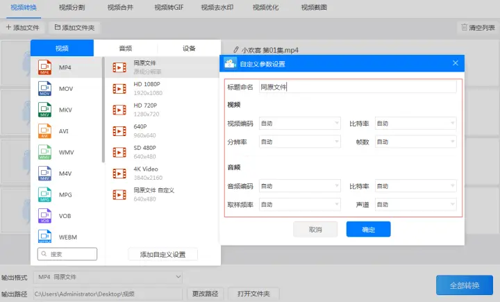 3、如果想自己调整输出格式的音频和视频参数可以点击添加自定义设置设置视频的视频编码、比特率、分辨率、帧数和音频的音频编码、比特率、取样频率、声道的参数。
