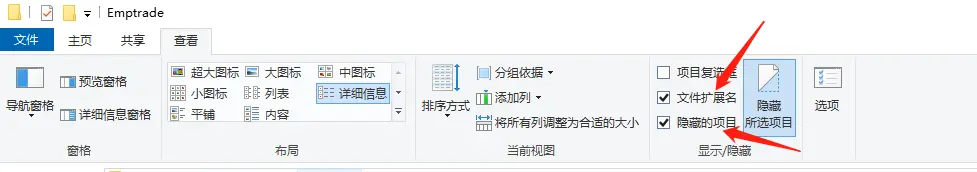 解决方法(win10):文件—>查看—>隐藏所选项目(勾上图示的两个框框)