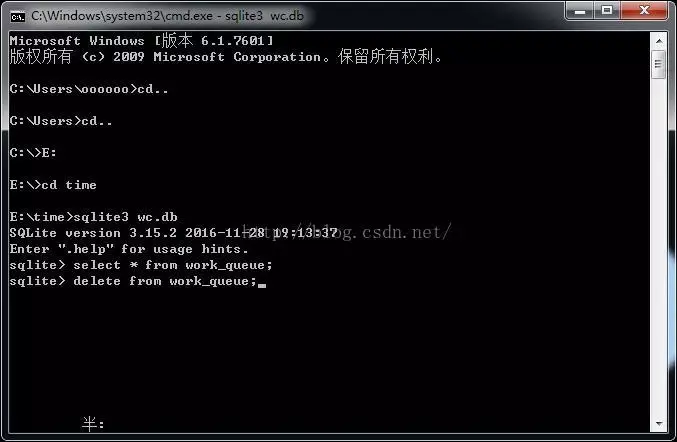 cmd运行输入sqlite3 wc.db回车,再输入select * from work_queue; -