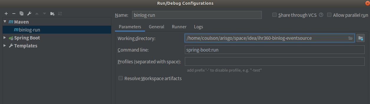 Runner ---> Skip tests 中配置:spring.profiles.active=dev