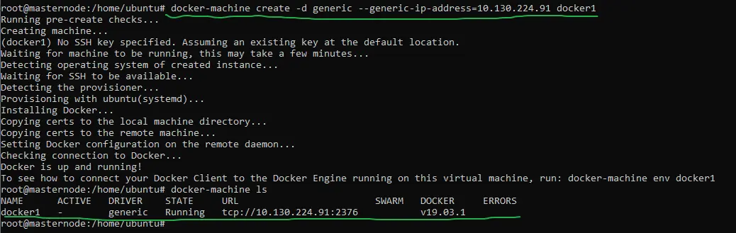 // docker文档到此处前并没有要求安装docker-machine,参见官方文档安装 // 此命令需要执行两次,分别使用B、C的IP,NodeName官方文档分别命名为了:myvm1 、myvm2,此处我命名为docker1、docker2 docker-machine create -d generic --generic-ip-address=IP NodeName