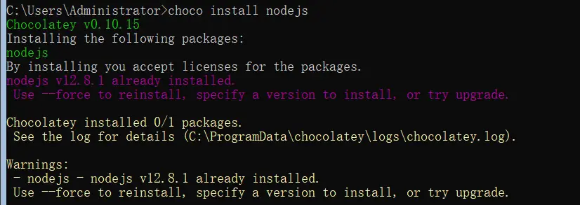 choco list --local-only和choco install前者用来查看本里已安装的软件包,后者用来安装软件,这里运行choco install Nodejs就可以安装Nodejs了。