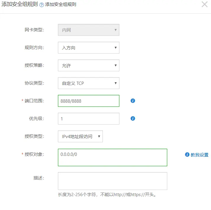 8888端口,安全组添加上我们代码里监听的8888端口就可以啦!这里0.0.0.0/0表示允许所有的IP访问我们的服务器。