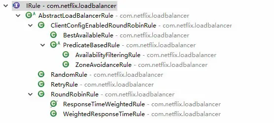 - RetryRule:对选定的负载均衡策略机上重试机制,在一个配置时间段内当选择server不成功,则一直尝试使用subRule的方式选择一个可用的server;