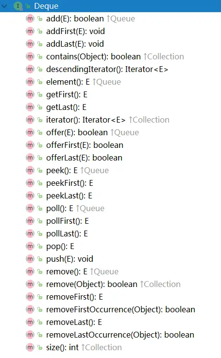 方法的作用可以根据方法名看出来,对比queue接口提供的方法,queue接口只提供了在队列尾部添加元素,获取移除队列首部的元素,而Deque接口实现了对于队列双端的添加删除操作