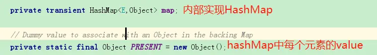 对于添加的元素key为要添加值,value为一个static final object对象,对于添加重复的值,以前的值会被覆盖