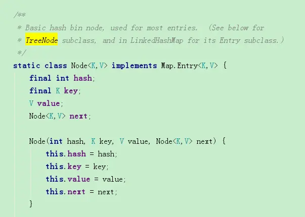 我们知道Hashmap中的数组存储的是链表的头节点的引用,那我们看下节点的结构: