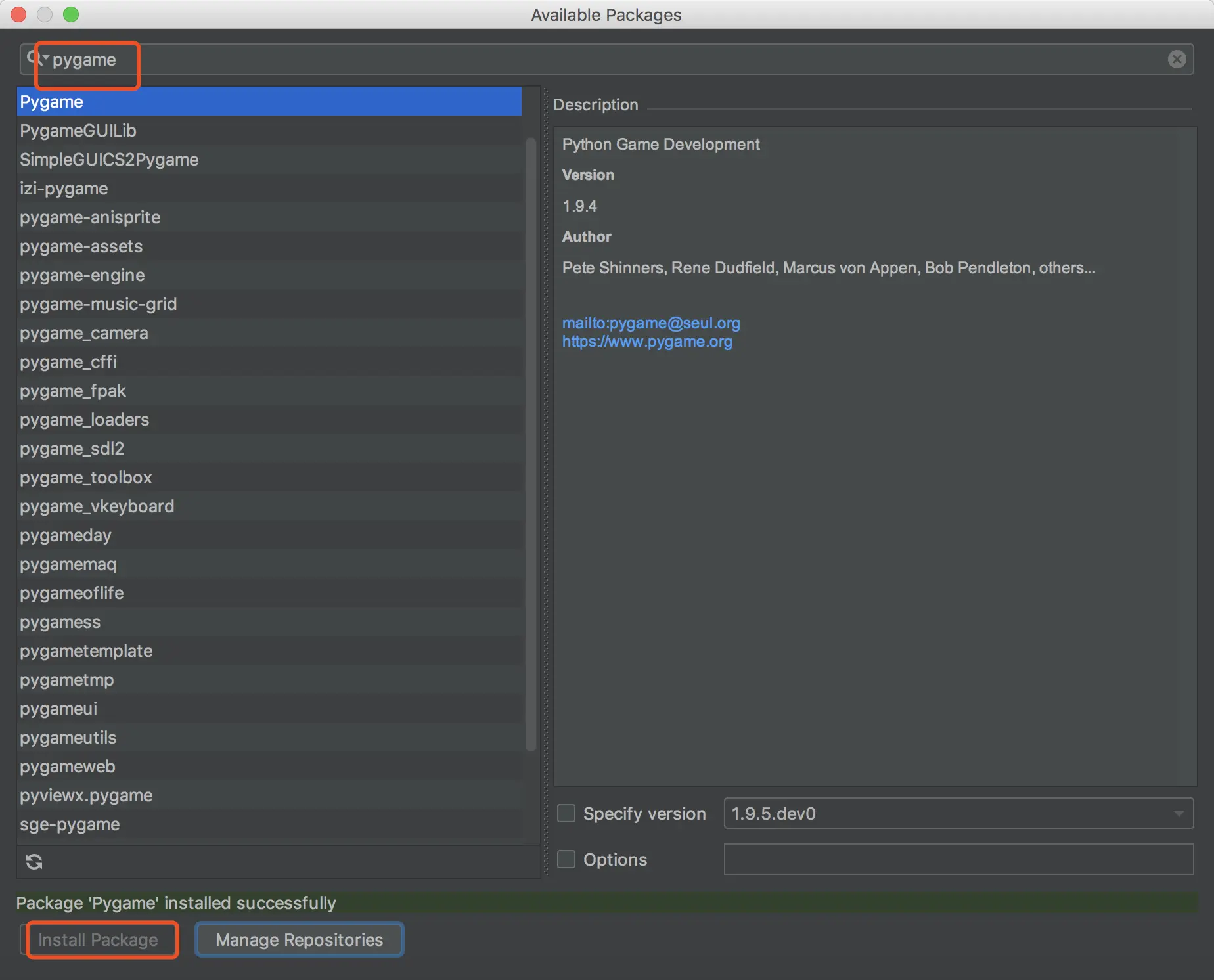 Pycharm for mac 引入pygame hello_chendf 2019-08-21 950 阅读1分钟 1.command+ 2.输入Project Interpreter进行搜索 3.点击下面+号 输入pygame,点击install进行安装 其他pycharm插件也通过这样的方式安装