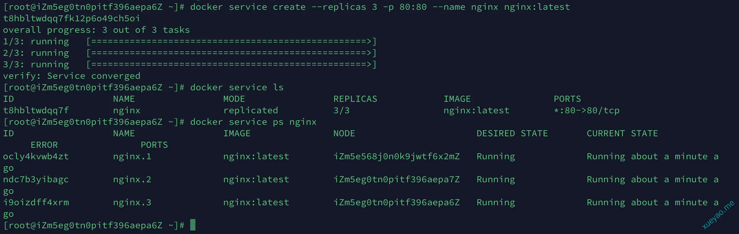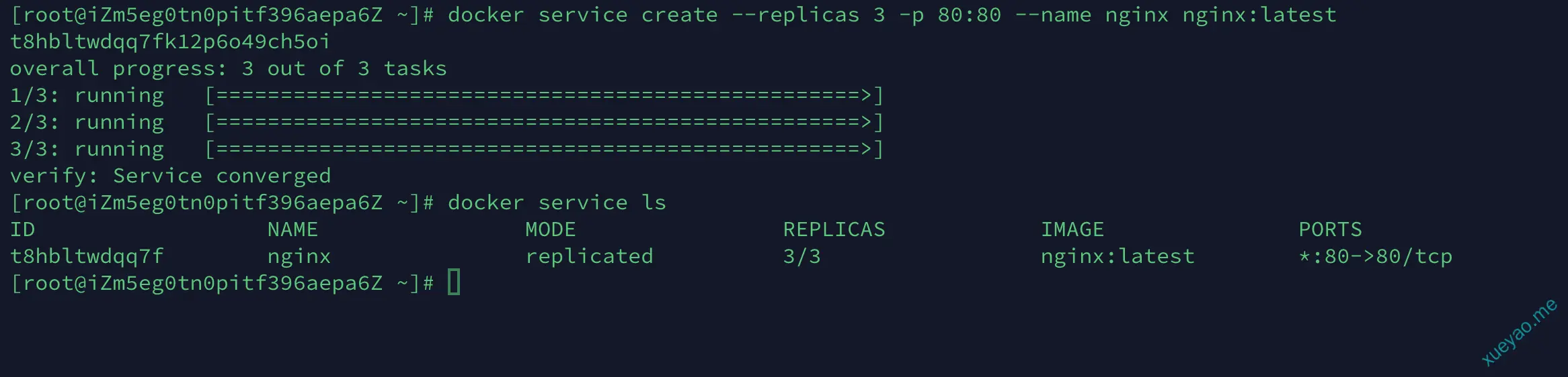 docker service create --replicas 3 -p 80:80 --name nginx nginx:latest