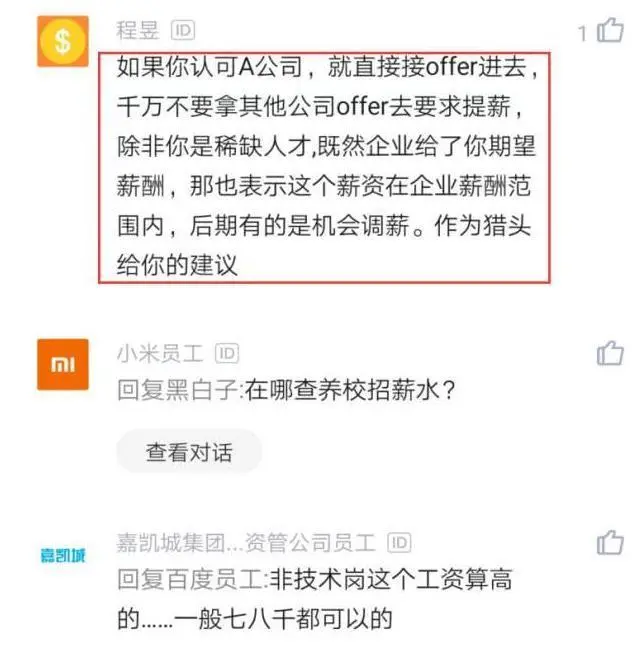 还有网友说你可以拿第二家公司的薪水去和第一家公司谈,就说如果公司也能给到同样的工资,那就马上入职。要是公司领导真的看重你的话,或许会给你涨点工资。