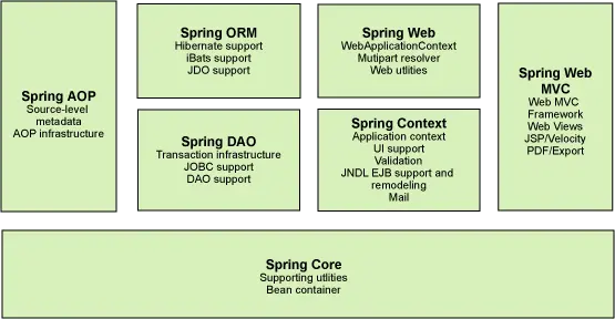 组成 Spring 框架的每个模块(或组件)都可以单独存在,或者与其他一个或多个模块联合实现。每个模块的功能如下: