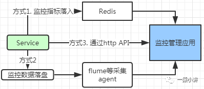 监控数据直接落盘的方式,可以细分为落到磁盘文件、写入共享存储例如 redis。其中落入磁盘文件,可以基于咱们之前谈及的 flume 等开源的轮子完成数据采集;其中写入 redis 的,监控管理应用,可以直接读取指标数据使用就行。