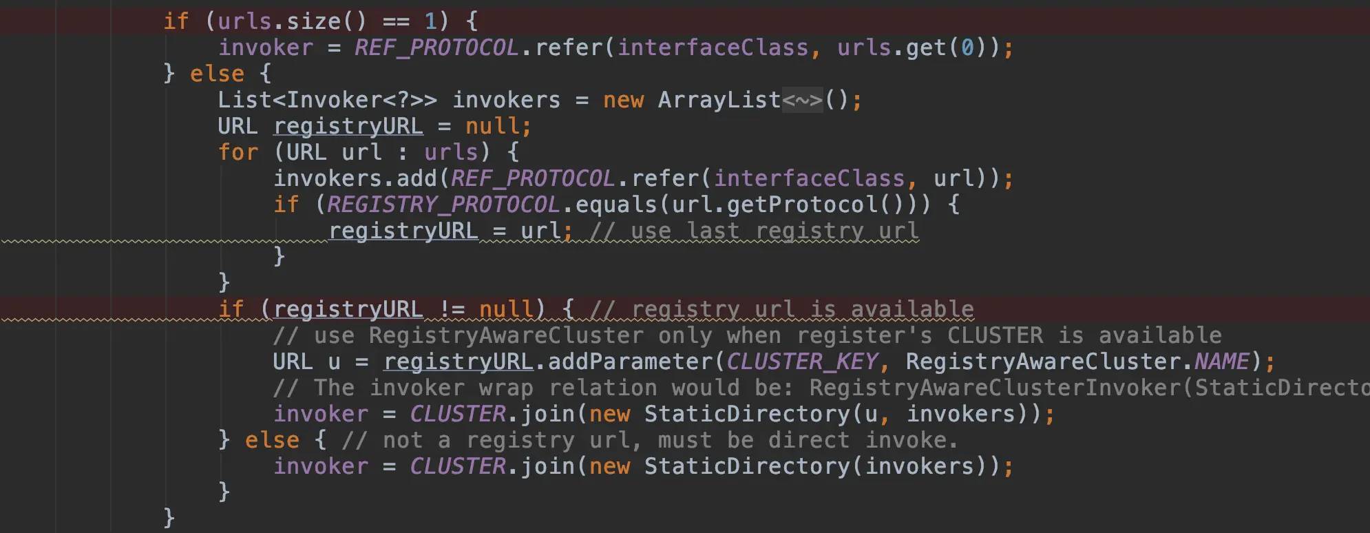 ReferenceBean中createProxy中部分,如果是多注册中心,则取最后一个注册中作为注册的URL,