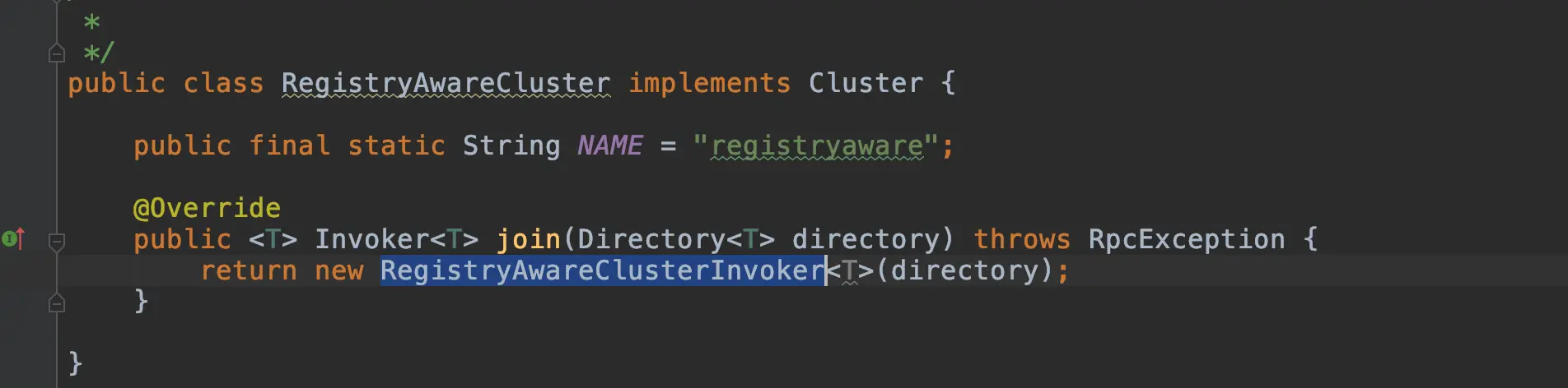 ClusterKey为RegistryAwareCluster类的join方法实现就是直接返回了RegistryAwareClusterInvoker并传入Directory抽象,从上一个图可以看出这个地方是传入是StaticDirectory这个类,传入注册中心的URL和协议引用后的Invoker(真实对象是FailoverClusterInvoker),