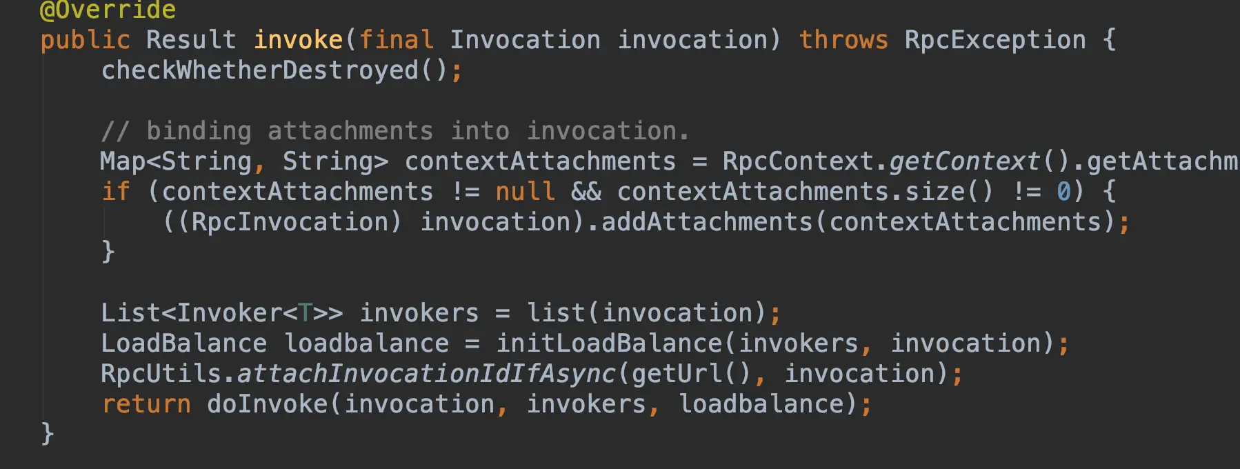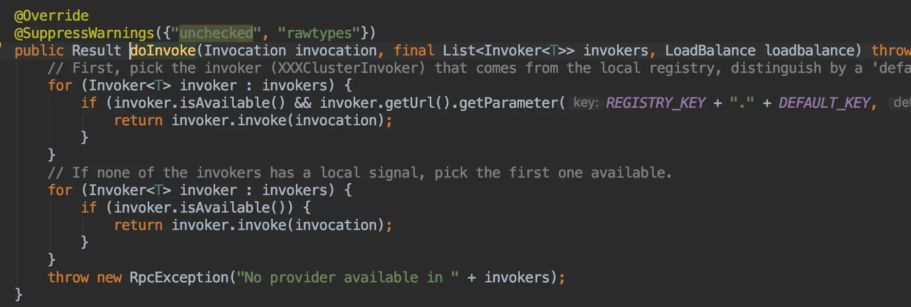 RegistryAwareClusterInvoker的doInvoke方法,如果服务可用并且URL含有default的key则直接调用默认的,如果没有defaultKey则判断Invokers中第一个可用的则调用invoke返回,其实