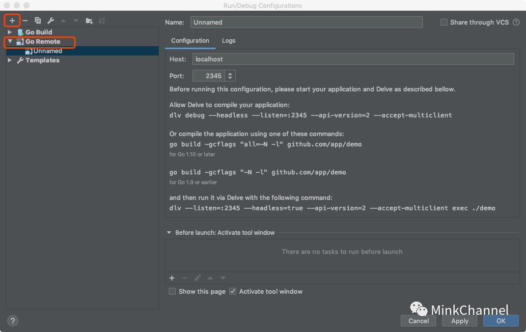 程序的编译和启动尽量按照IDE的提示说明进行. 在 GoLand 中点击菜单栏 Run -> EditConfigurations -> + -> GoRemote. 我们将看到如下界面. 中间为编译及启动说明.