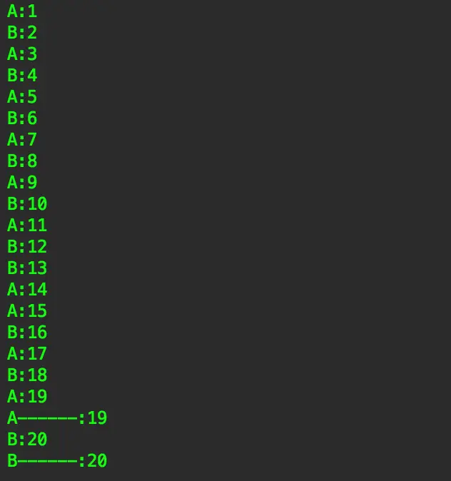 上述代码的输出结果是无法确定的,下面是它的执行结果之一: