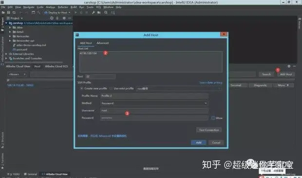 - 点击 AddHost 按钮,在弹出的弹窗中,依次输入代理机的IP地址、用户名和密码(如下图所示:47.95.120.154 这台机器就是我们添加的机器 P),。