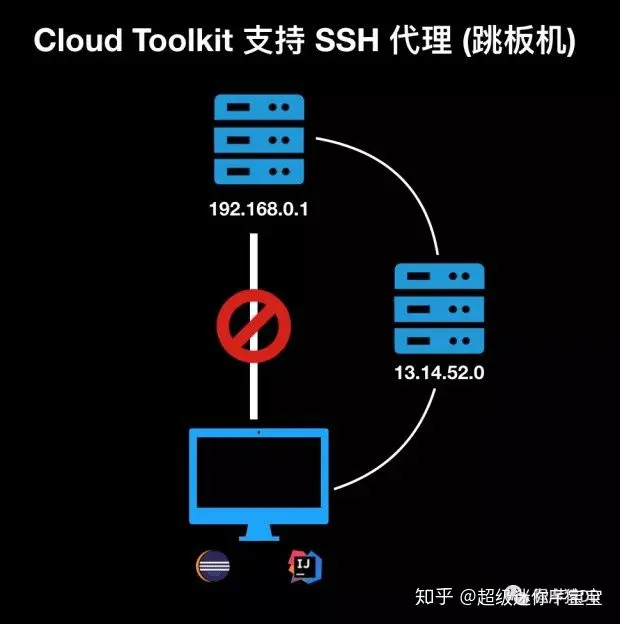 在部署的场景里,部分开发者会遇到如上图的困境:出于安全考虑,本地开发机和远程部署服务器 192.168.0.1 之间,网络上是不连通,只能通过一台代理机(俗称 “跳板机” )来打通网络环境。针对这样的情况,新版本 Cloud Toolkit 已经支持了 SSH 代理,来解决这部分开发者的困境,操作步骤如下: