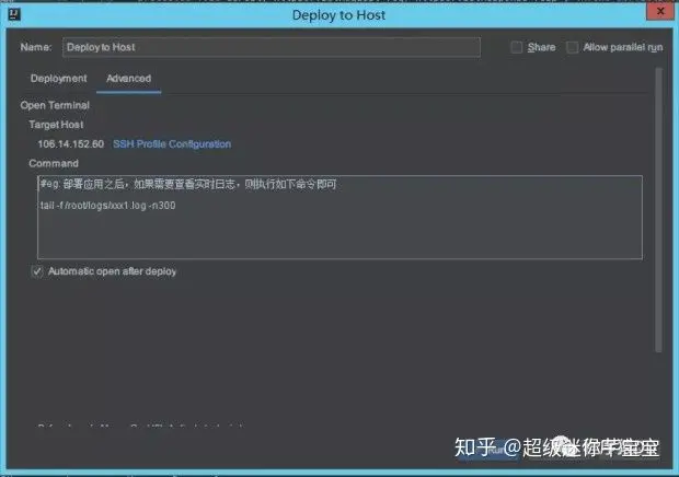 2、在 Command 中填入查看实时日志的命令即可,并且勾选上 “Automatic open after deploy”,这样配置之后,就会在应用部署过程中,打开实时日志查看的 Terminal 了。查看实时日志的命令一般为: