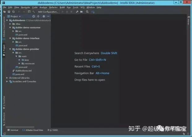 如下图所示,就完成了一个完整的 Dubbo 工程的创建了,此工程的结构和 Apache Dubbo 官方样例工程完全一致。