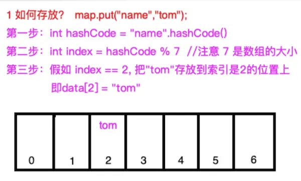 - "name".hashCode() % 7 的值假如为2 ,那么value也就是"tom"应该存放的位置就是2