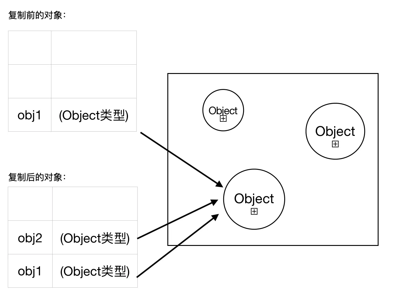 从上面的代码我们能看出来,obj1将值赋给obj2后,修改obj1中的值,obj2中的值也跟着改变了。这是因为它们引用的都是同一个变量。下面这张图展示的就是保存在变量中的"对象"和保存在内存中的对象的关系: