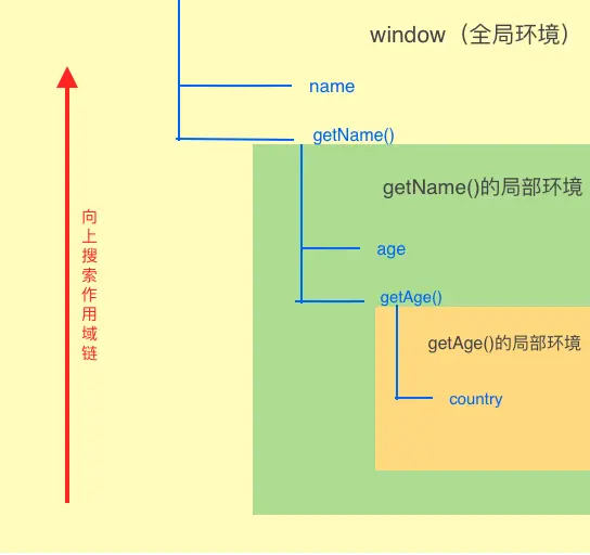 首先,上面代码有3个执行环境:全局环境、getName()的局部环境和getAge()的局部环境。用一张图来显示整个执行环境如下:
