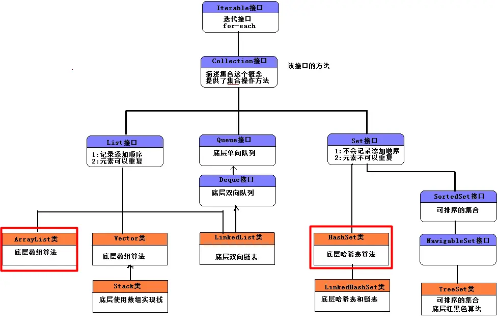 - Collection 规范了集合的常用方法,包含添加,删除,是否包含,迭代器等常用功能。