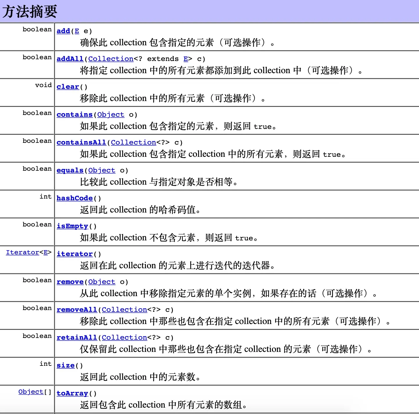 - 整个Collection接口是集合的根接口,Collection用来描述一组对象,描述集合这个概念