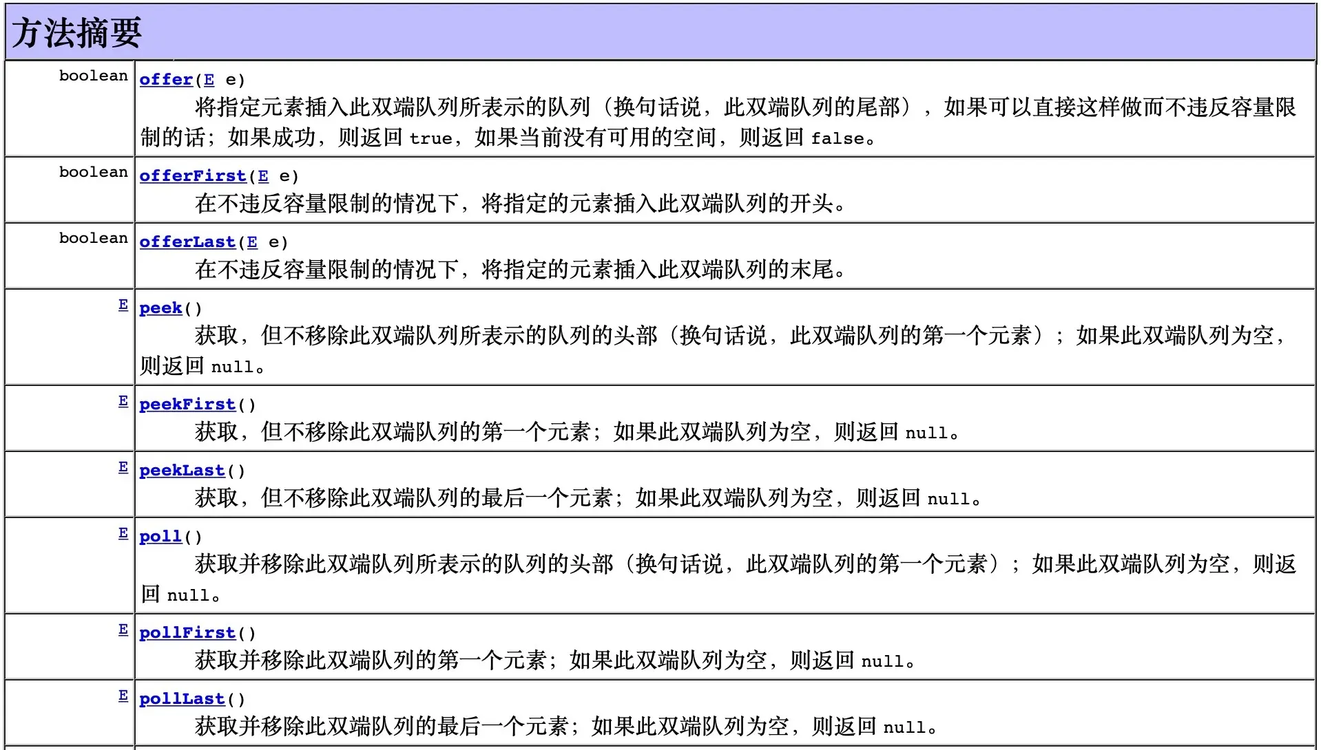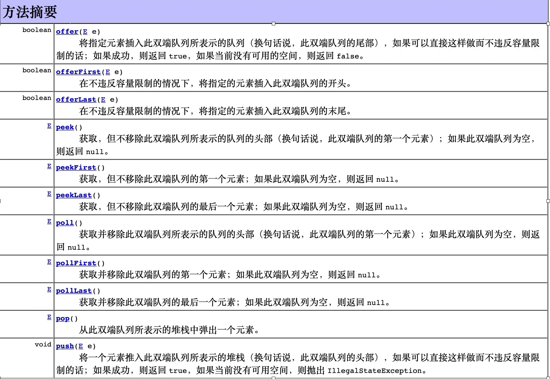 - 此接口定义在双端队列两端访问元素的方法。提供插入、移除和检查元素的方法。