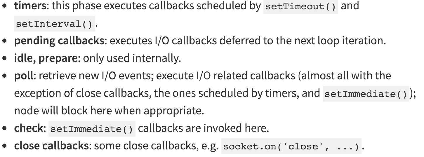 你可能已经注意到process.nextTick()不在上面的图表中,即使它也是异步api。这是因为严格意义上来说process.nextTick()不属于event loop中的一部分,它会忽略event loop当前正在执行的阶段,而直接处理nextTickQueue中的内容。