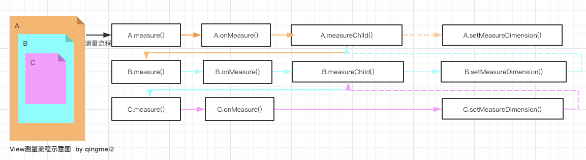 View measure --> onMeasure --> setMeasuredDimension -->setMeasuredDimensionRaw(保存自己的宽高)