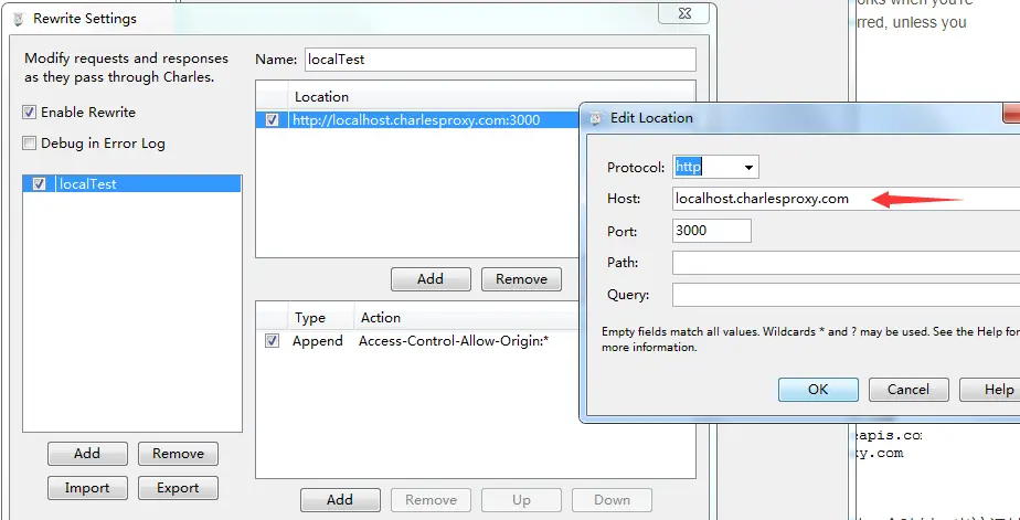 第二步是在Charles的rewrite中修改localhost为localhost.charlesproxy.com,见下图