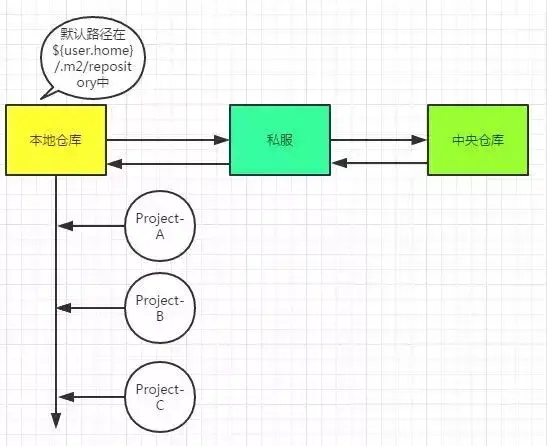 你要jar包,不可能每次都要联网去下载吧,多费劲,所以本地仓库就是相当于加了一层jar包缓存,先到这里来查。如果这里查不到,那么就去私服上找,如果私服也找不到,那么去中央仓库去找,找到jar后,会把jar的信息同步到私服和本地仓库中。
