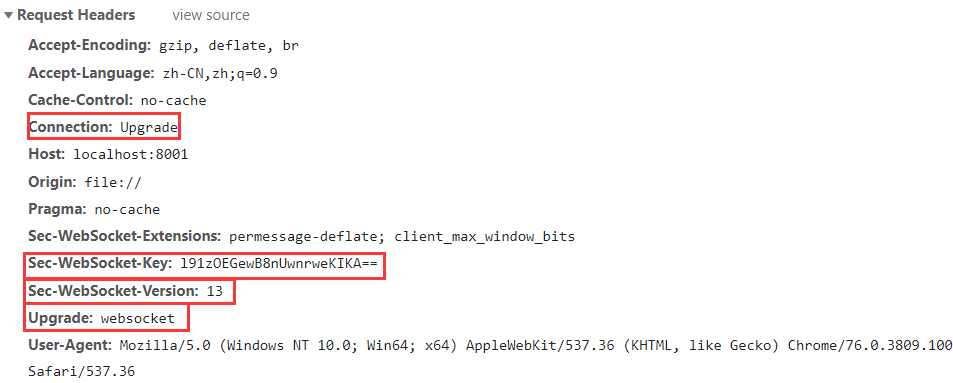 Connection:Upgrade:表示要升级协议Upgrade:WebSocket:表示要升级到WebSocket协议Sec-WebSocket-Key与后面服务器端响应首部的Sec-WebSocket-Accept是配套的,提供基本的防护,比如恶意的链接,或者无意的连接Sec-WebSocket-Version: 13:表示WebSocket的版本。如果服务器不支持该版本,需要返回一个Sec-WebSocket-Version的header,里面包含服务端支持的版本号